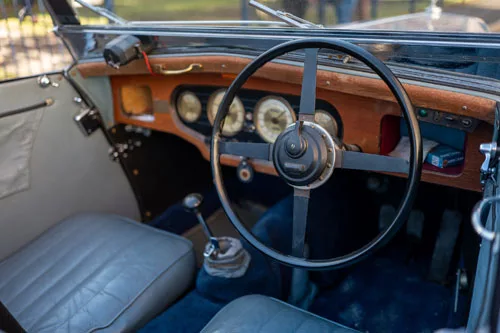 The wooden dash provides a home for the brass dressed British Jaeger gauges and instruments. These consist of a speedometer, tachometer and two dual purpose gauges monitoring water temperature, amps, oil pressure and fuel level. The large steering wheel rim and centre as well as the original gear knob, are made of Bakelite.