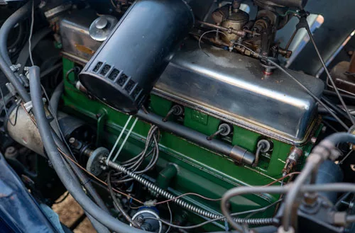 The doors open widely with the front pair being of the “suicide” variety. Canvas and plexiglass side screens are fitted and easily removed when required. The large canvas hood is in excellent condition and has clearly been replaced in its previous ownership. The hood is surprisingly quick and easy to open and stow given its size.