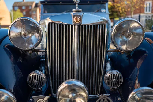 The long bonnet is double hinged both sides to provide excellent access to the 2.2 litre engine. Each flank of the bonnet panels is punctuated by four hinged vents, each with its own chromed and MG monogrammed handle. The sweeping front wings terminate in wide running boards fitted with chrome protective bars topped with rubber.