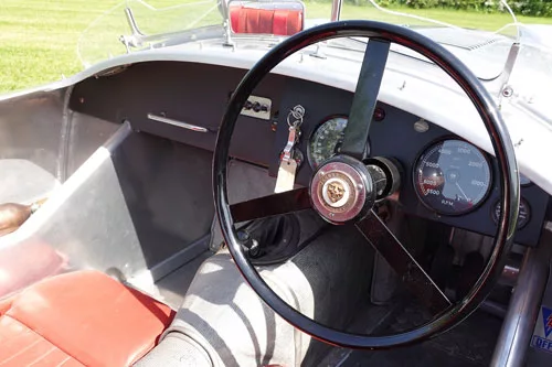 The engine compartment presents extraordinarily well, and with the clamshell raised, showcases the twin exhausts flowing down the nearside of the car as well as the double wishbone front suspension and tubular construction. The solid fuel tank (as opposed to 1953-specification bag) at the back was manufactured when the car was imported in 2018, and sits above a storage bay that features a small tool bag and a spare wheel. All tyres are matching Dunlop Racing items that are period correct for the car.