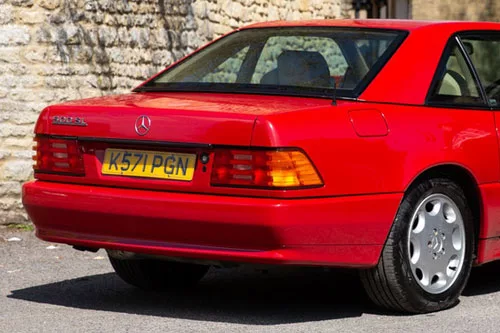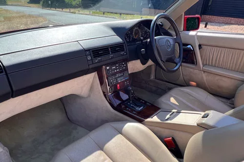 Finished in striking Signal Red, this pre-facelift example of the R129 has the trademark looks of a Mercedes of this era. The large rectangular headlights, colour-coded bodywork and unmistakable front grille and badge provide a front end with purpose and kick off a gentle wedge profile towards the squared rear.