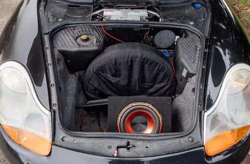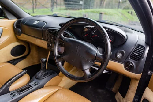 Moving our attention toward the interior, this Boxster is presented in a lovely two tone beige and black colour scheme which would appear to be somewhat rare. This interior feels both comfy and sporty, offering a sense of warmth while also having seats to hold you taught in the corners. Being a 90s designed interior, with a four cd holder and a very driver focused interface it’s a lovely place to be. Previous owner fitted an aftermarket touchscreen head unit designed specifically for the Boxster, it adds modern features such as Bluetooth and hands free calling while not looking out of place.